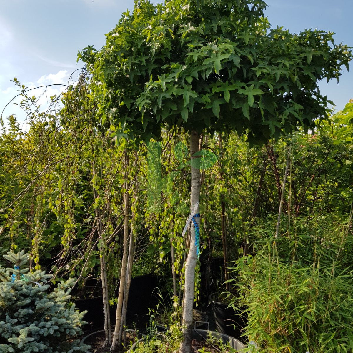 Zdjęcia przedstawiają egzemplarze Liquidambar styraciflua `Gum Ball` w wybranych rozmiarach.