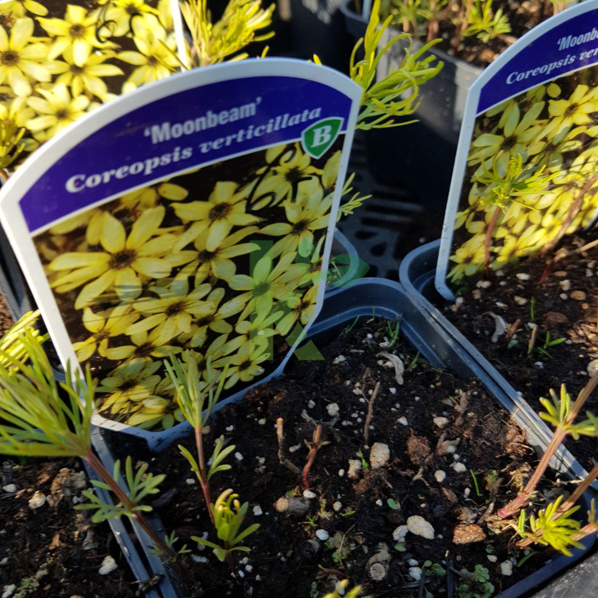 Zdjęcia przedstawiają egzemplarze Coreopsis verticillata `Moonbeam` w wybranych rozmiarach.