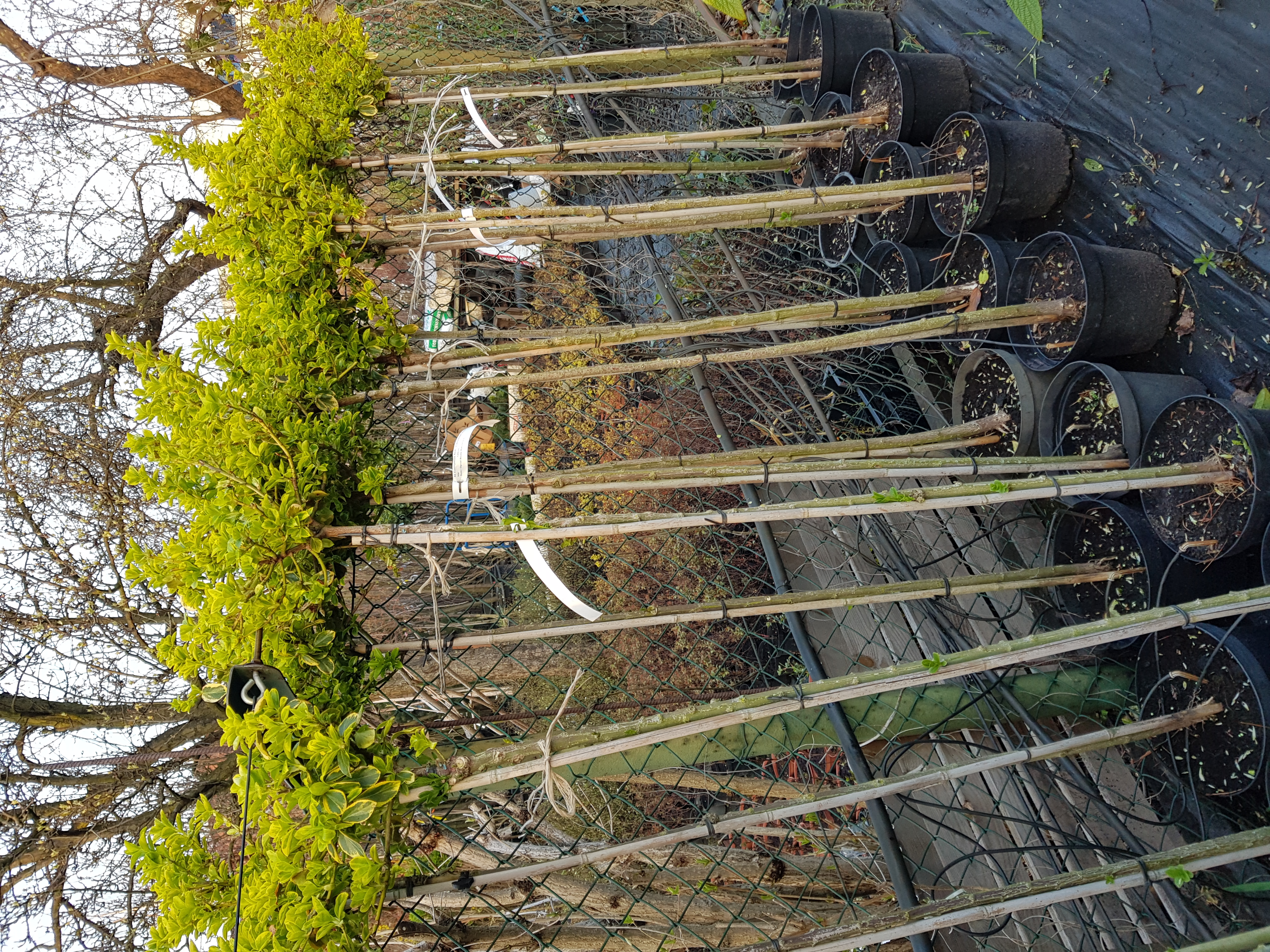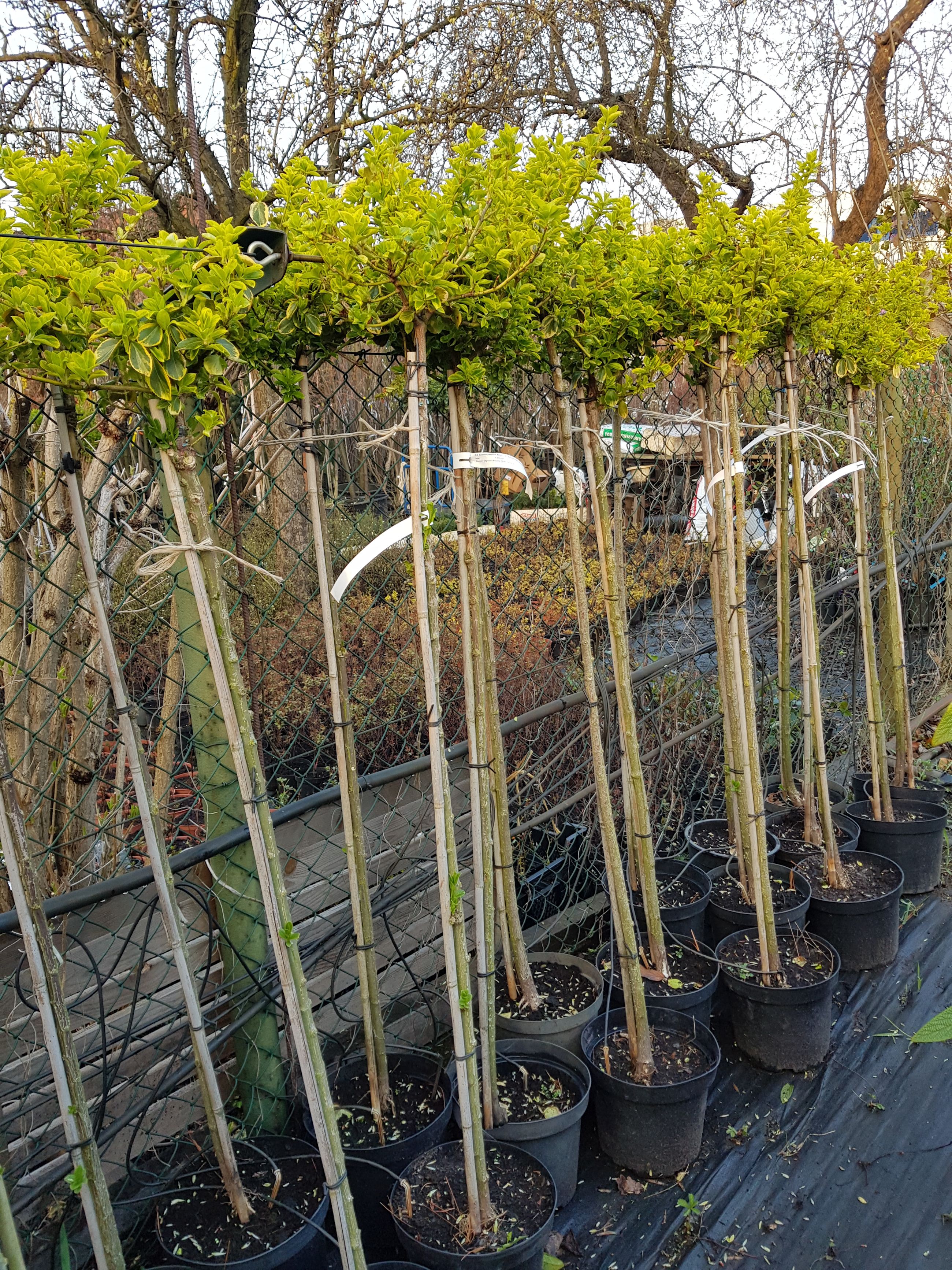 Zestawienie otwiera jedna z popularniejszych roślin na nóżce - trzmielina. To prosta w uprawie roślina, która najbardziej znana jest w formie niskiego, płożącego krzewu. W formie szczepionej na pniu, cieszy jasnymi, żółto-zielonymi, zimozielonymi liśćmi. Odmiana ta jest w pełni mrozoodporna.